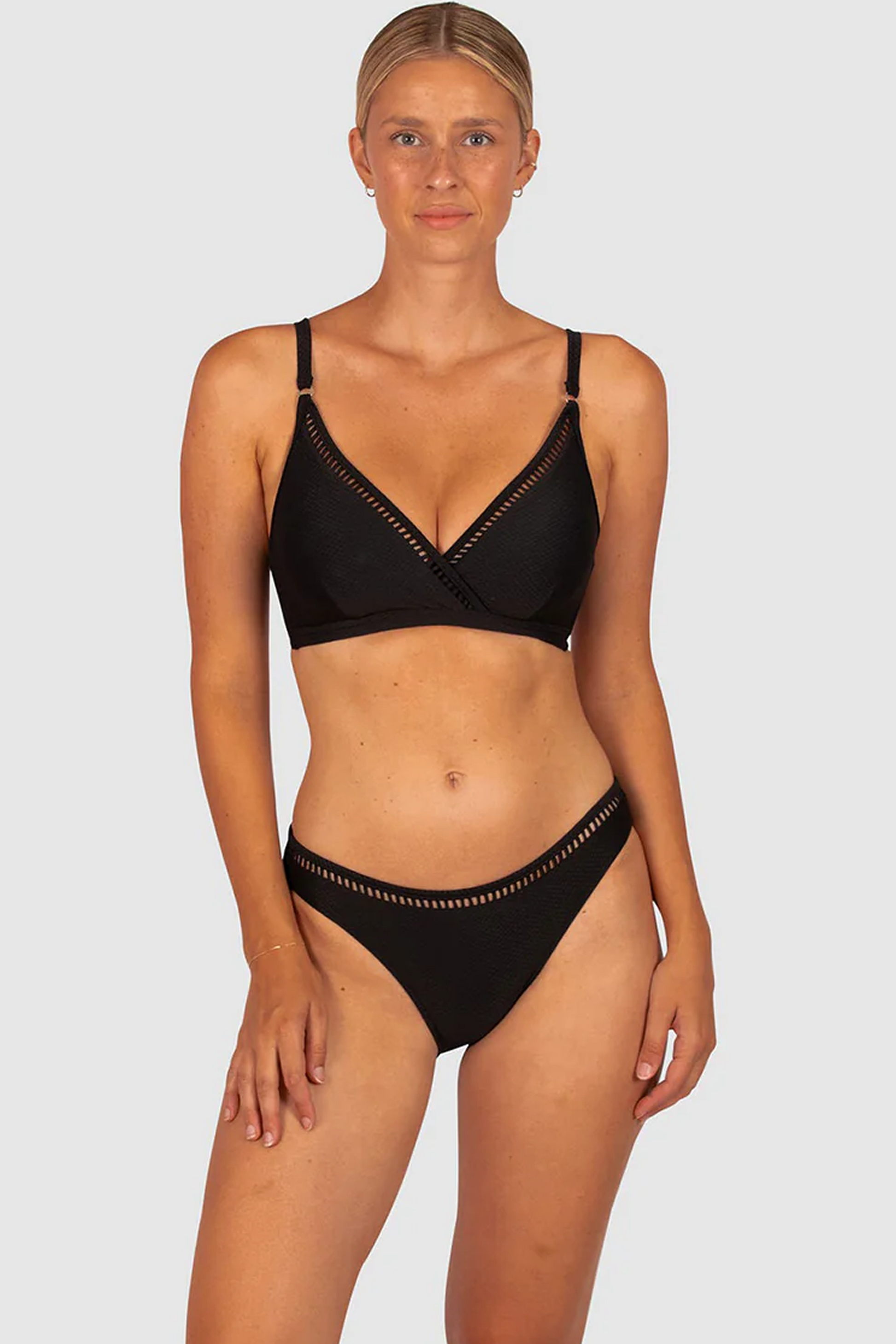 Baku's Rococco D–E Ladder Lace Wrap Bikini Bra combines elegance and support with its ladder lace and wrap detailing, underwire support, removable soft cups, and power mesh stability. Designed with side boning, a clip-back closure, and adjustable, convertible straps, it offers a customisable and flattering fit for a range of body types. Crafted from Rococco, Baku’s best-selling solid fabrication, this buttery-soft yet structured material provides shaping power that ensures confidence and sophistication. Made from a luxurious Spanish textural fabric of 85% polyamide and 15% elastane, the bra is proudly designed in Australia.