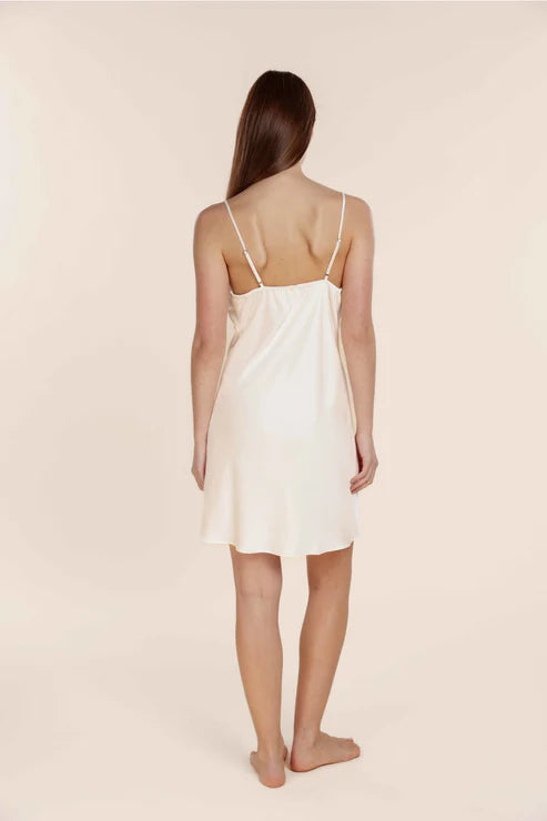 The Azalia Short Chemise in ivory brings an understated elegance you can wear well beyond the bedroom. Made from recycled silky satin, it feels soft against the skin while skimming the body in a flattering cut. The lace detail at the bust adds a romantic touch, and the adjustable straps ensure comfort all day or night. Falling above the knee, it works just as well for a slow morning at home as it does layered under a trench for an effortlessly chic evening look.