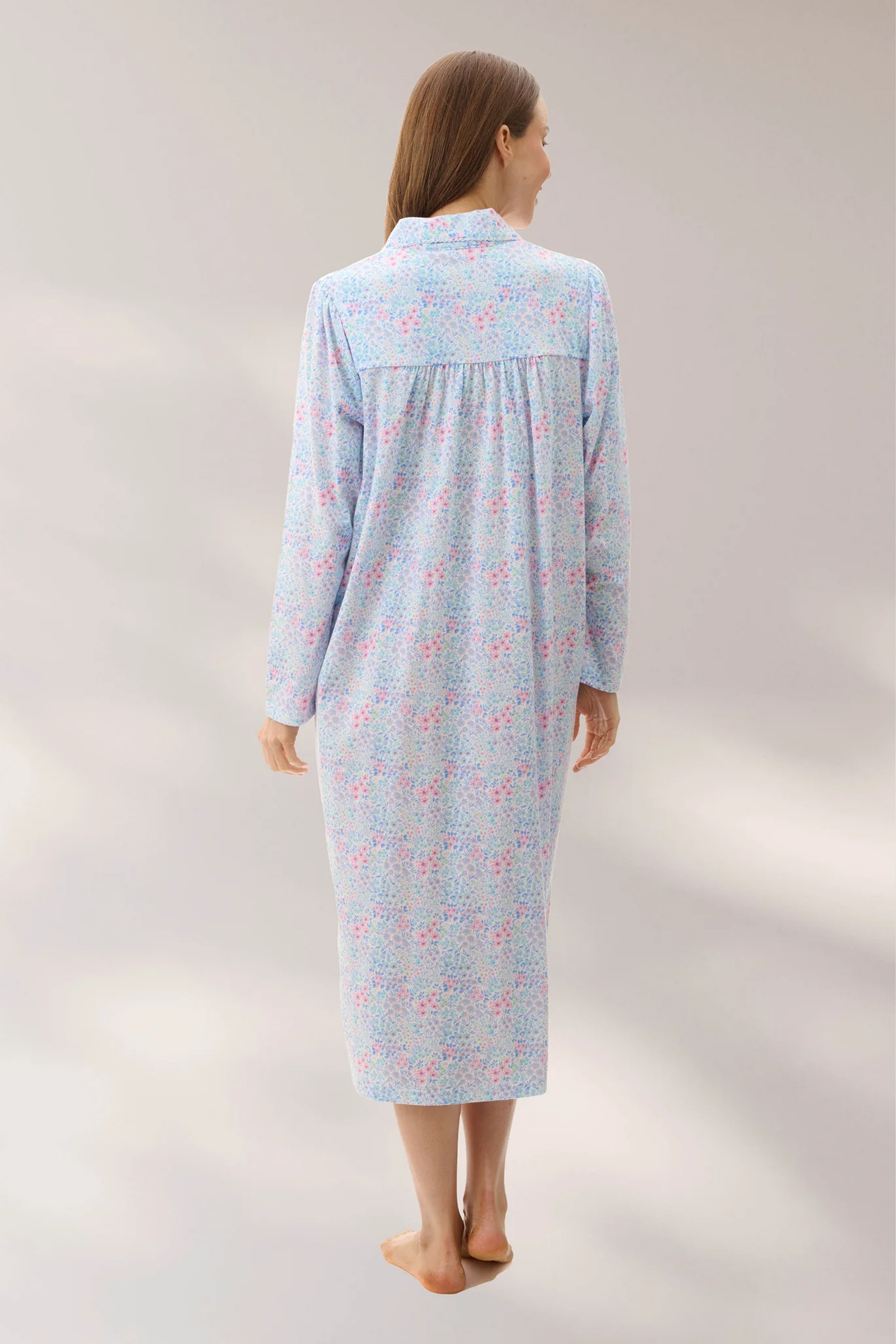 Mid length nightie in a multi coloured floral print on soft and comfortable knit jersey. Nightie has long sleeves, the collar has pichouette scallop stitch, and the curved yoke trimmed with piping. A placket front opening with buttons. Soft gathers fall from the yoke to the front skirt.