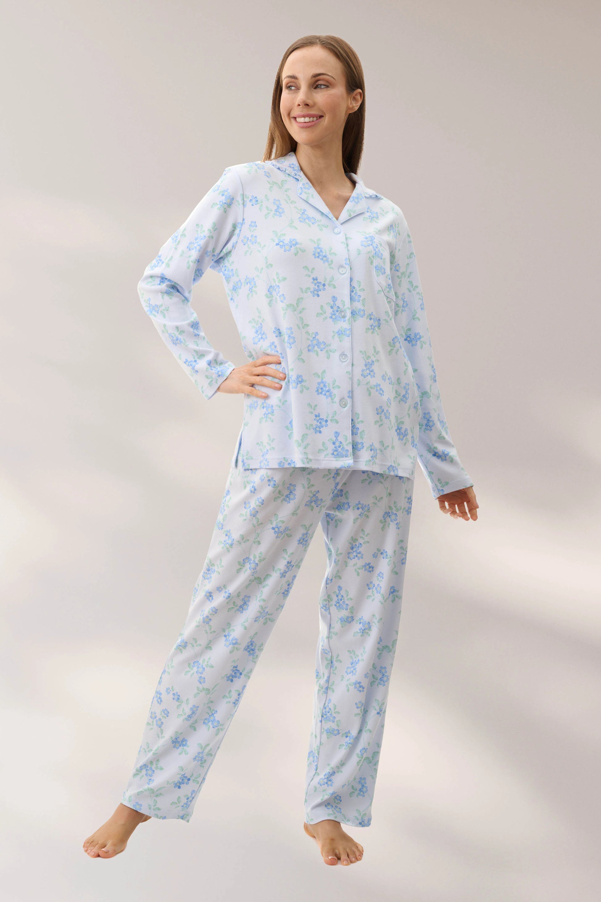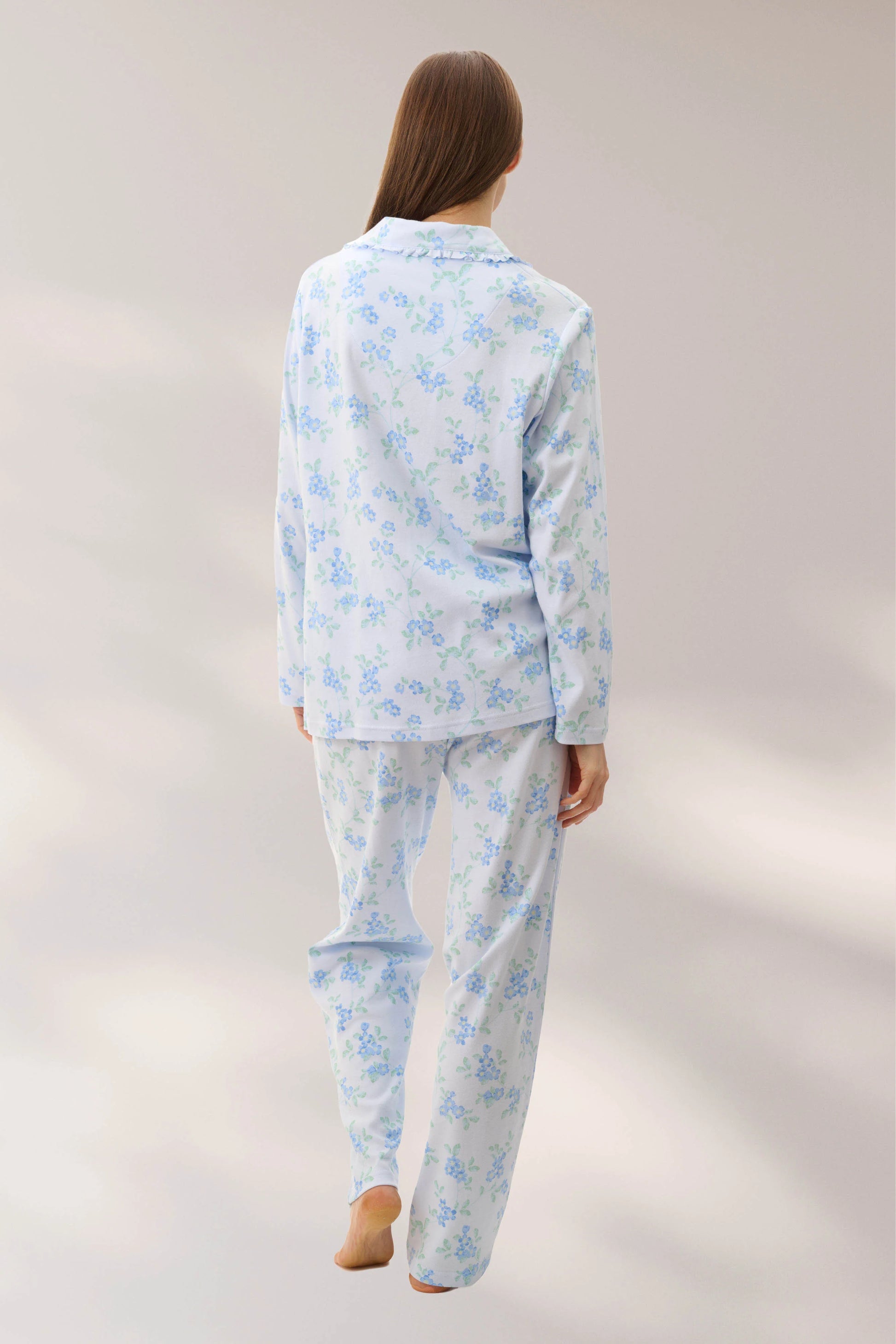 Long pyjama with self frill on the collar. Soft blue floral print on comfortable winter weight cotton interlock. Button front opening and a chest pocket. Long pant with a comfortable elastic waist and a drawstring tie.