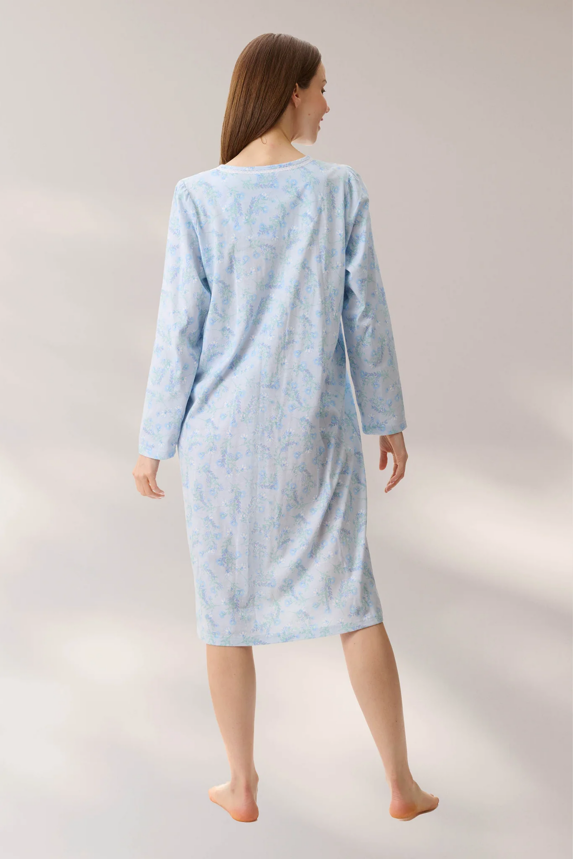 Short length nightie in a gorgeous blue floral. Round neck with self binding and narrow lace trim. The front bib of the nightie is detailed with pintucks and lace, with gathers falling to the skirt.