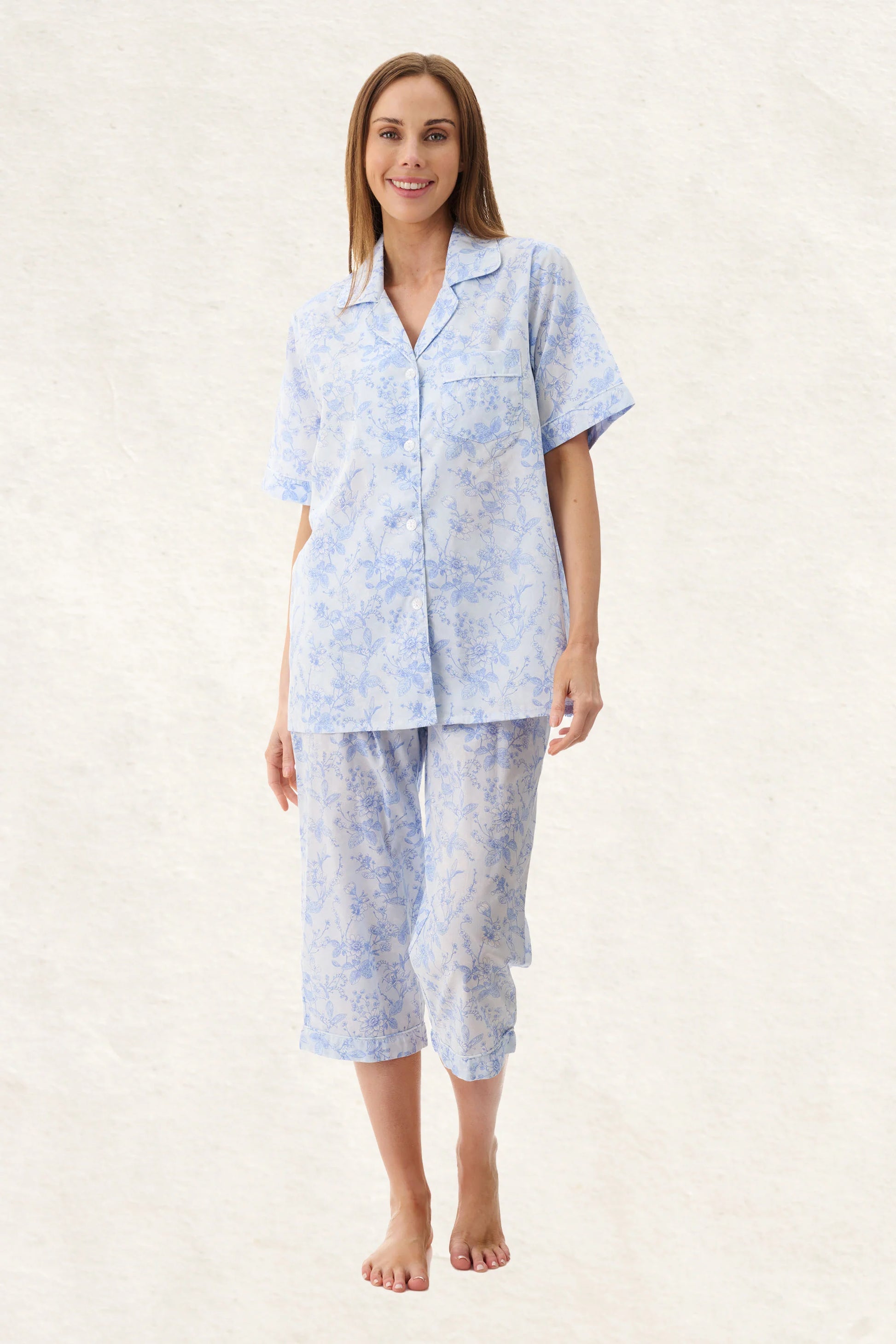 The Eliza print capri pyjama set features a fresh floral print in blue and white tones, perfect for warmer nights. A classic short sleeve pyjama top with collar, front chest pocket, and full front button opening. The pyjama is trimmed with self piping. The capri length pants have a soft elastic waist with a self fabric drawstring.