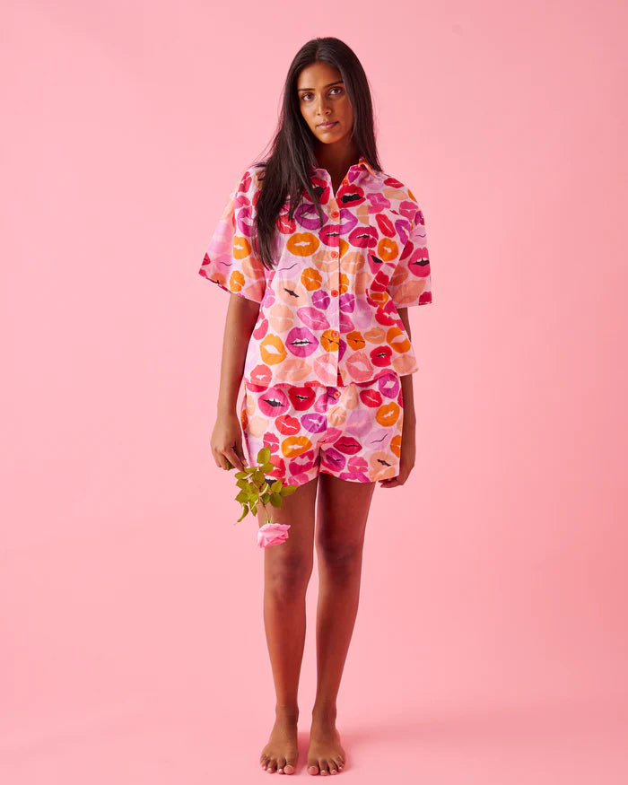 Pucker up and snuggle down. Covered in playful kisses, this smooch-worthy Kiss Me Adult Organic Cotton Short Sleeve Shirt and Short Pyjama Set brings a flirty pop of fun to your nightwear rotation. Breathable and lightweight, with elasticated waist for the sweetest of sleeps. Mwah!